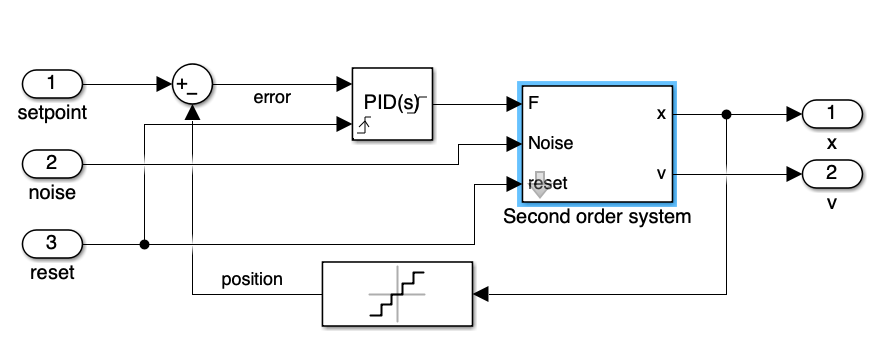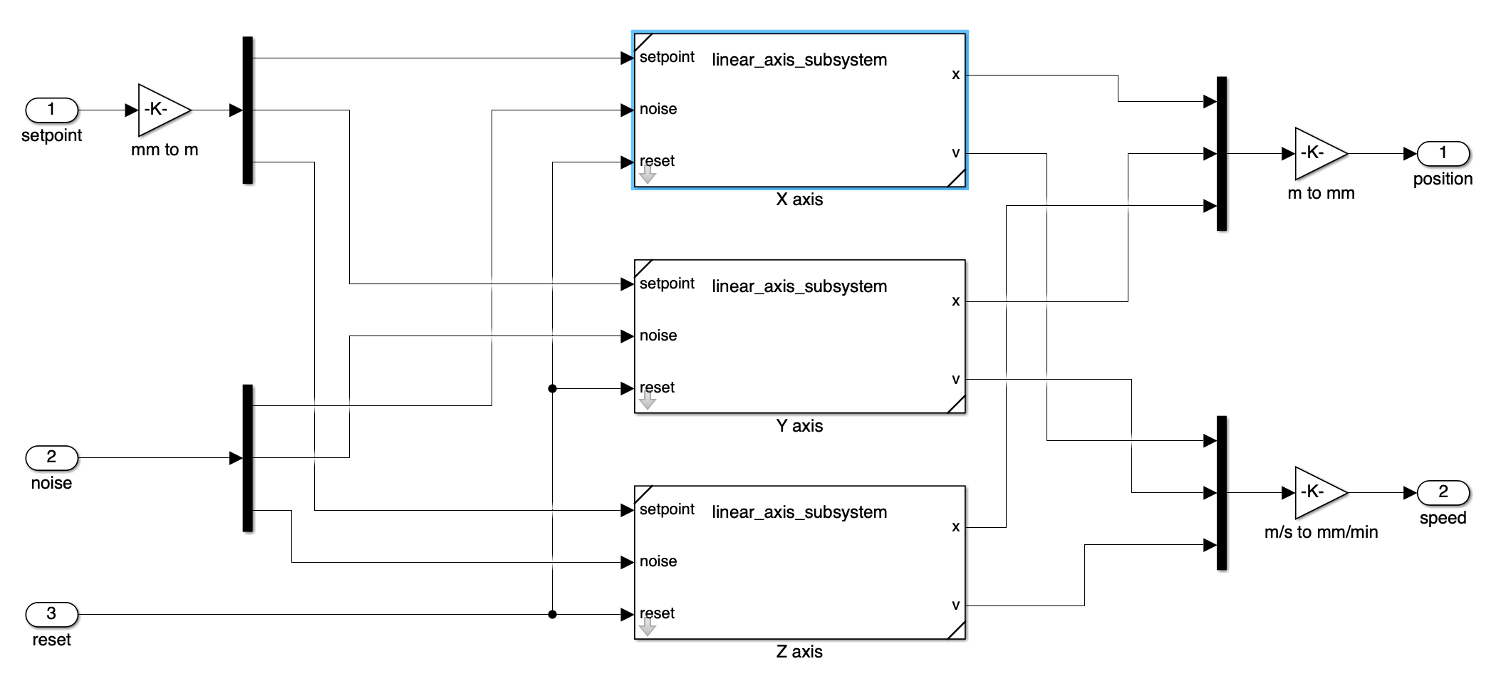 DoubleMassSpringDamper: name says it all. No inputs.linear_axis: a second-order dynamics linear actuator with a PID controller on position. Inputs: setpoint; outputs: axis position and speed.machine_tool: a cartesian manipulator made by a combination of three linear axes.