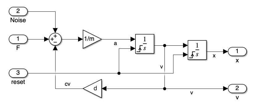 To create an FMU, you can use a modeling tool that supports FMI export, such as Modelica or Simulink. In this guide, we will use Simulink as an example, creating a dynamic model of a 3-axes cartesian manipulator, made by three identical subsystems, each one made by a mass, a spring, and a damper. The model must contain input and output ports, which will be used for communication with the MADS environment.