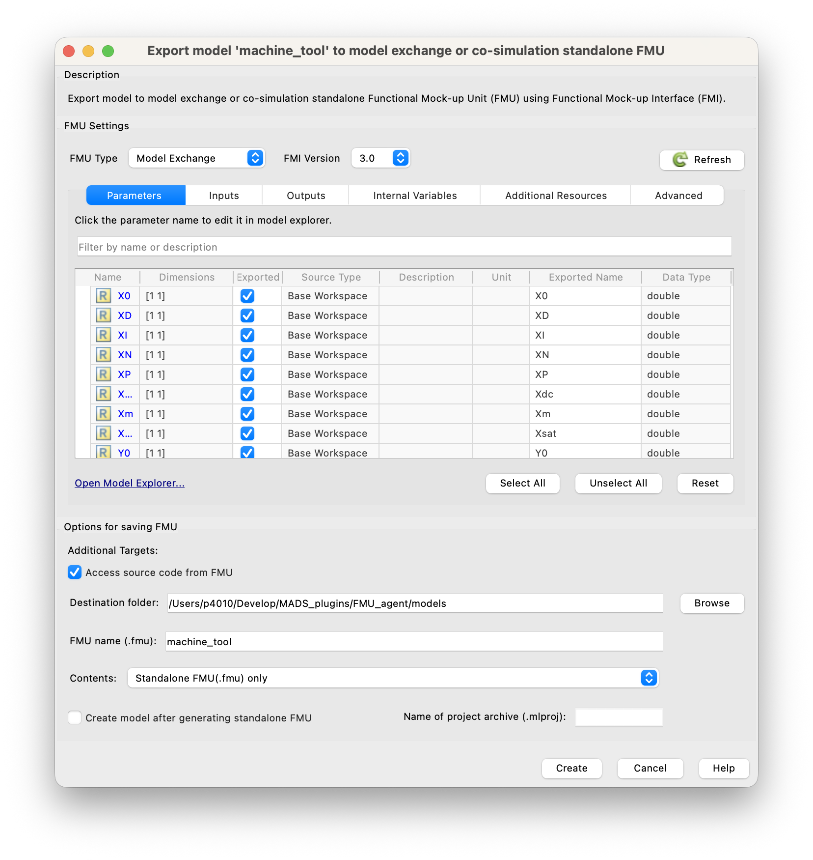 Carefully check all the tabs in the export panel and be sure that inputs, outputs, and parameters are correctly identified and named, with the data type you expect. This will ensure that the FMU can be correctly used in the MADS environment.