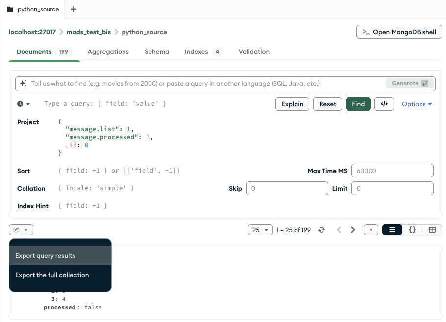 We only want to export the elements with keypaths message.list and message.processed. Then expand the Options… query menu and set the Project field as: