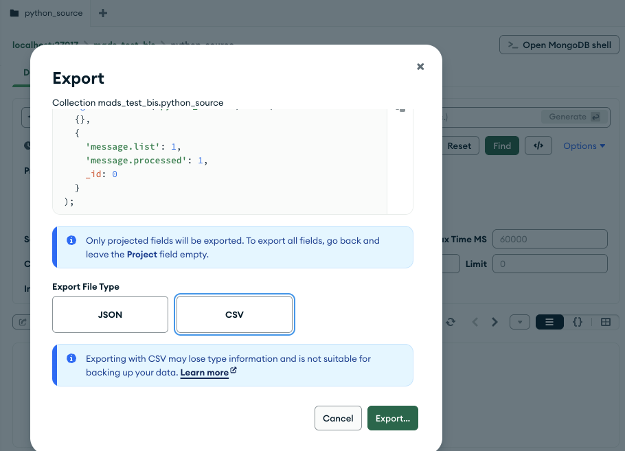 Another possibility is to use MADS to record data in the MongoDB database, then use MongoDB Compass to export the data as CSV.